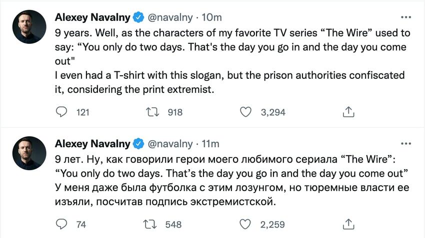Politicianul citează în engleză un citat din serialul The Wire: „Ai doar două zile. Una e atunci când intri, a doua când pleci”. Navalnîi spune că are și un tricou cu acest mesaj, însă cei de la penitenciar i-au interzis să îl îmbrace pentru că ar fi extremistă.