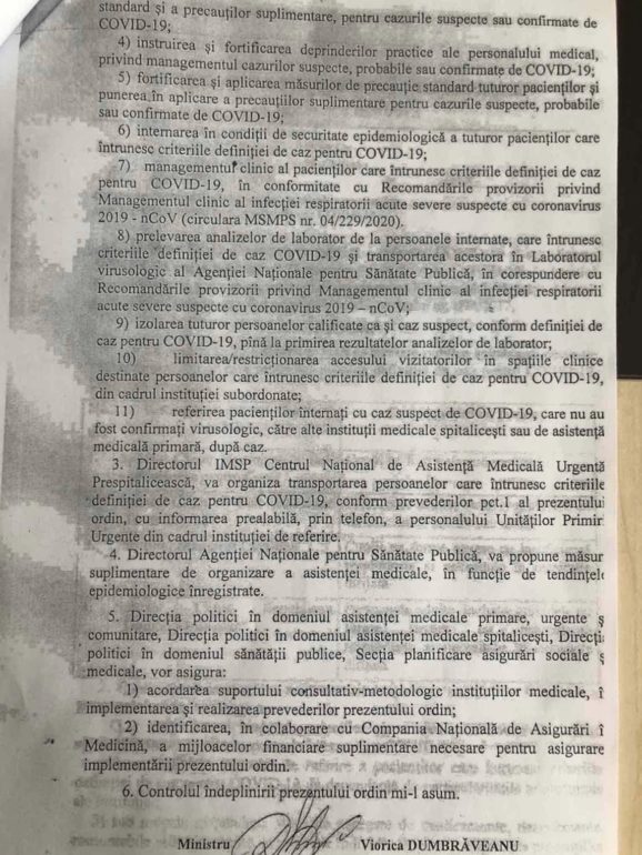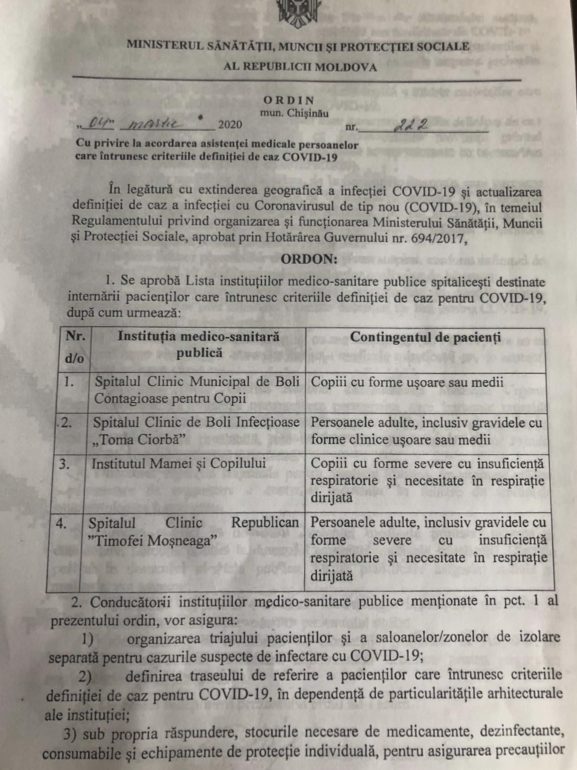 Conform Ordinului intern al MSMPS nr. 222 din 04.03.2020 au fost desemnate instituțiile specializate pentru acordarea asistenței medicale pacienților care întrunesc definiția de caz pentru COVID-19, după cum urmează:
