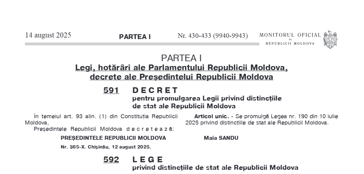 În Republica Moldova a fost adoptat un sistem modernizat de distincții de stat, publicat astăzi în Monitorul Oficial. Printre noutăți se numără „Ordinul Libertății”, acordat pentru promovarea democrației și drepturilor omului, și medalia „Meritul Academic”, destinată profesorilor și cercetătorilor cu rezultate remarcabile.