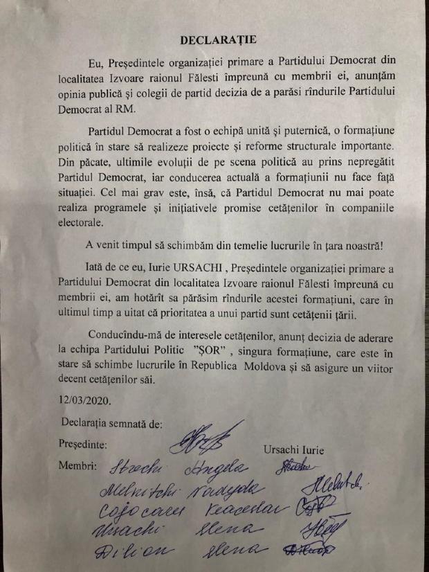 „Am aderat la echipa Partidului „Șor”, deoarece este singura formațiune care este în stare să schimbe lucrurile în Moldova și să asigure un viitor decent cetățenilor”, se menționează în declarația semnată de cei foști șase membri ai organizației primare a PDM din Izvoare.