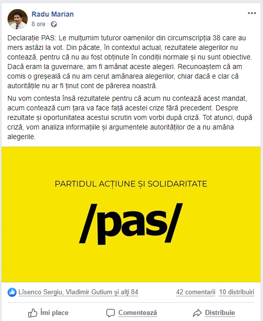 Declarație PAS: Le mulțumim tuturor oamenilor din circumscripția 38 care au mers astăzi la vot. Din păcate, în contextul actual, rezultatele alegerilor nu contează, pentru că nu au fost obținute în condiții normale și nu sunt obiective. Dacă eram la guvernare, am fi amânat aceste alegeri. Recunoaștem că am comis o greșeală că nu am cerut amânarea alegerilor, chiar dacă e clar că autoritățile nu ar fi ținut cont de părerea noastră.
