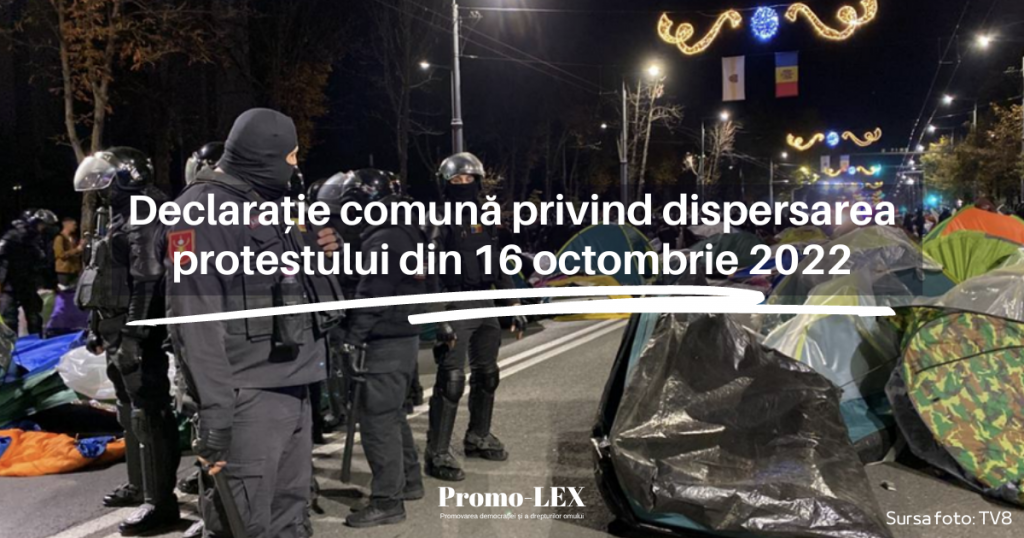 Prin prezenta declarație condamnăm încălcarea dreptului la libertatea întrunirilor admisă de autoritățile publice în seara zilei de 16 octombrie 2022 prin dispersarea protestului desfășurat în fața Parlamentului Republicii Moldova cu excepția părții carosabile și cerem autorităților să acționeze în strictă conformitate cu legea și standardele internaționale în domeniul drepturilor omului atunci când gestionează întrunirile publice.