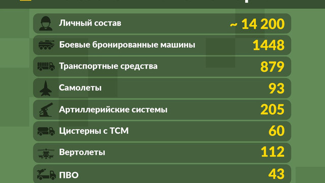 De asemenea, armata ucraineană a distrus 450 de tancuri rusești, 1 448 de vehicule blindate, 205 sisteme de artilerie, 72 de lansatoare de rachete, 43 de sisteme de apărare aeriană, 879 de vehicule, 3 nave/ambarcațiuni, 60 de cisterne transportatoare de combustibil și 12 drone. În plus, au fost doborâte 93 de avioane rusești și 112 elicoptere.