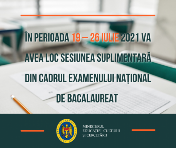 În perioada 19 – 26 iulie, în conformitate cu Programul de desfășurare a sesiunii de examene 2021, va avea loc sesiunea suplimentară din cadrul examenului național de bacalaureat.