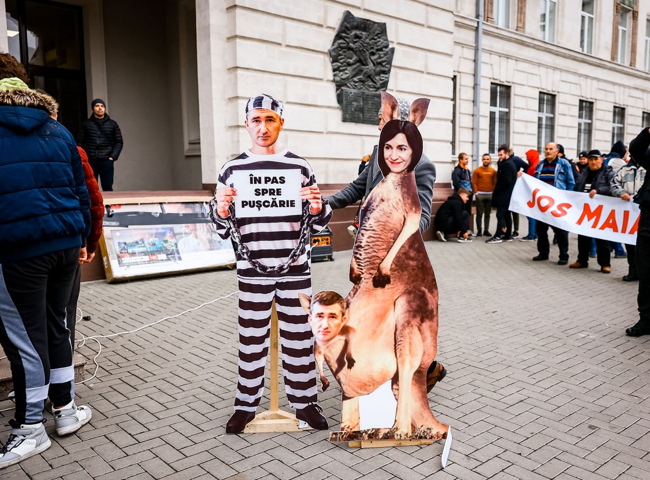 Participanții la protest au adus un banner mare cu stâlpii de care se sprijină șeful statului, pentru a se menține la putere. De asemenea, oamenii au adus macheta unui cangur, cu fața Maiei Sandu, din marsupiul căruia se vede capul lui Ion Munteanu, procurorul de buzunar al președintelui.