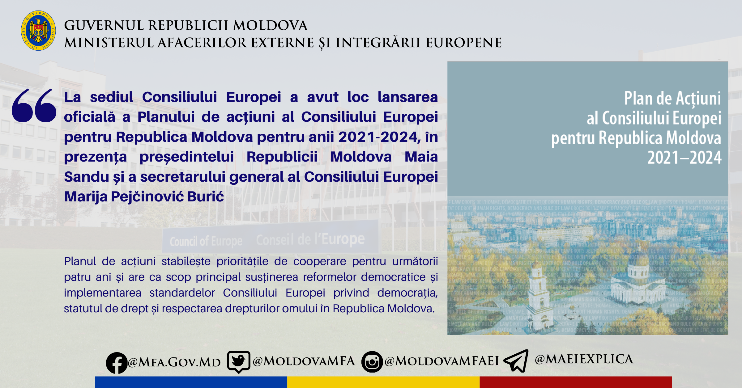 La sediul Consiliului Europei a avut loc lansarea oficială a Planului de acțiuni al Consiliului Europei pentru Republica Moldova pentru anii 2021-2024, în prezența președintelui Republicii Moldova Maia Sandu și a secretarului general al Consiliului Europei Marija Pejčinović Burić.