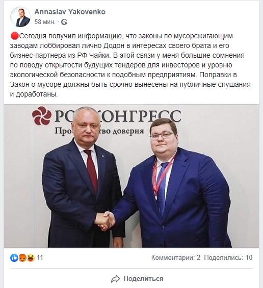 Analistul politic Annaslav Yakovenko, a publicat pe pagina sa de Facebook o informație, conform căreia, Igor Dodon ar fi persoana care personal a lobat proiectul de lege privind deșeurile. Acest lucru a fost făcut în interesul fratelui său și a partenerului acestuia de afaceri, Artiom Ceaika, fiul procurorului general al Rusiei.