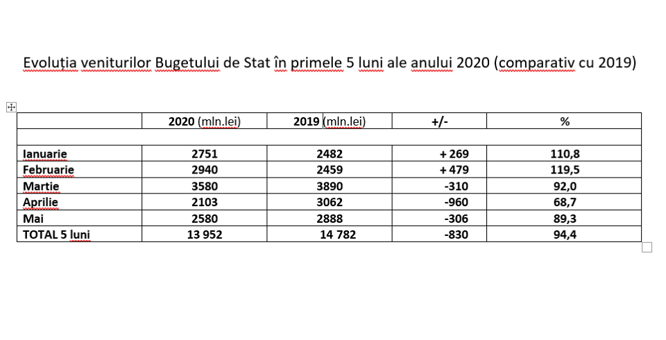 Deoarece pe celelalte componente ale Bugetului Public Național avem o creștere cumulativă a veniturilor cu 430 mln.lei, diferența între veniturile totale acumulate la BPN în primele 5 luni ale anului 2020 față de 2019 este de circa 400 mln.lei.