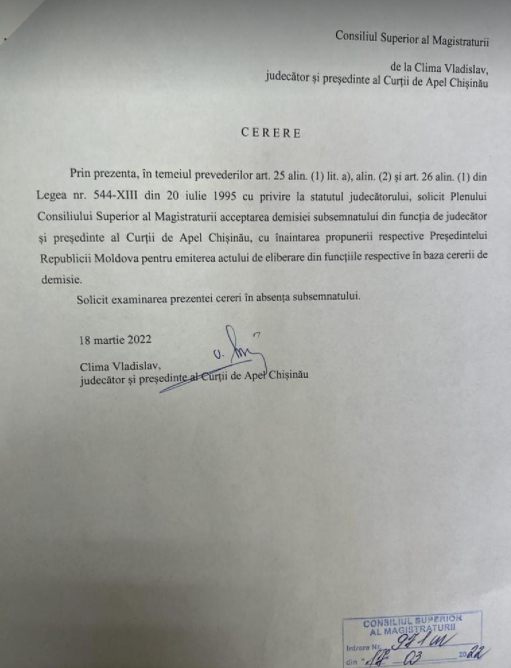 Președintele Curții de Apel (CA) Chișinău, magistratul Vladislav Clima, a depus joi, 17 martie, cerere de demisie la Consiliul Superior al Magistraturii (CSM), informează Ziarul de Gardă.
