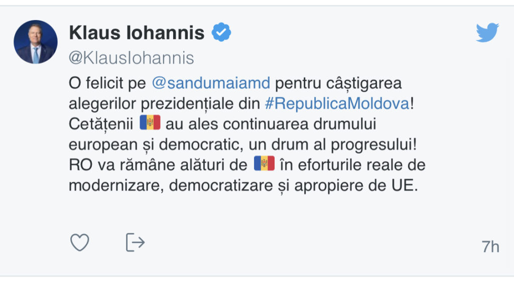”O felicit pe Maia Sandu pentru câștigarea alegerilor prezidențiale din RepublicaMoldova! Cetățenii au ales continuarea drumului european și democratic, un drum al progresului! RO va rămâne alături de în eforturile reale de modernizare, democratizare și apropiere de UE”, este mesajul lui Iohannis.