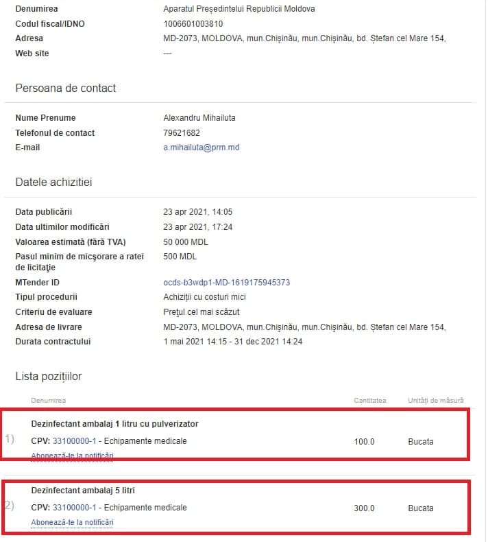 Potrivit site-ului oficial de achiziții publice, instituția prezidențială planifică să procure 100 de sticle de un litru și alte 300 de sticle de 5 litri de substanță dezinfectantă. Un simplu calcul ne arată că zilnic la președinție se vor folosi aproape 9 litri de dezinfectanți.