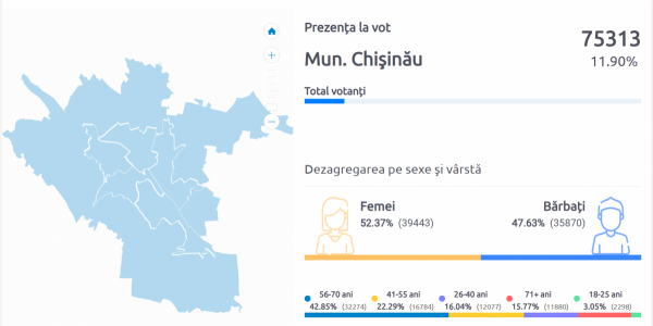 Aproape 60% din alegătorii din Chișinău care s-au prezentat la vot până la această oră au peste 55 de ani. Cetățenii cu vârste cuprinse între 18 și 40 de ani reprezintă sub 19% din alegători.