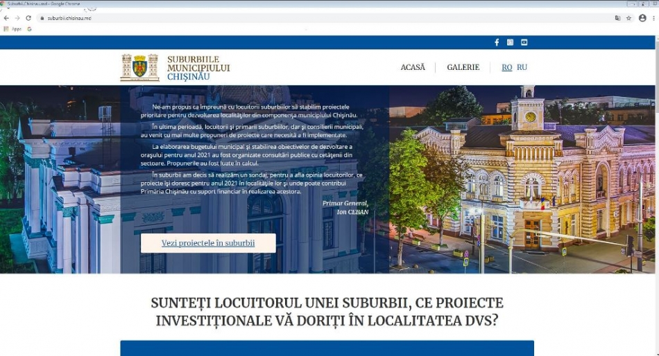 Primarul General, Ion Ceban, a declarat că noua platformă online are drept scop colectarea părerilor cetățenilor din suburbii, referitor la investițiile care urmează să fie făcute în orașele, comunele și satele lor.