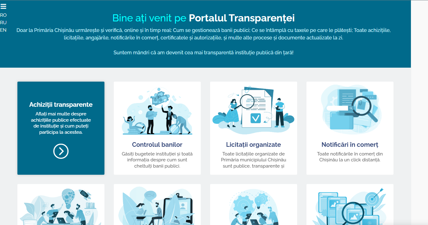 „Portalul transparenței” – transparenta.chisinau.md, reprezintă o interfață web structurată pe domenii de interes public, care conține informații veridice și oficiale furnizate de Primăria Municipiului Chișinău.