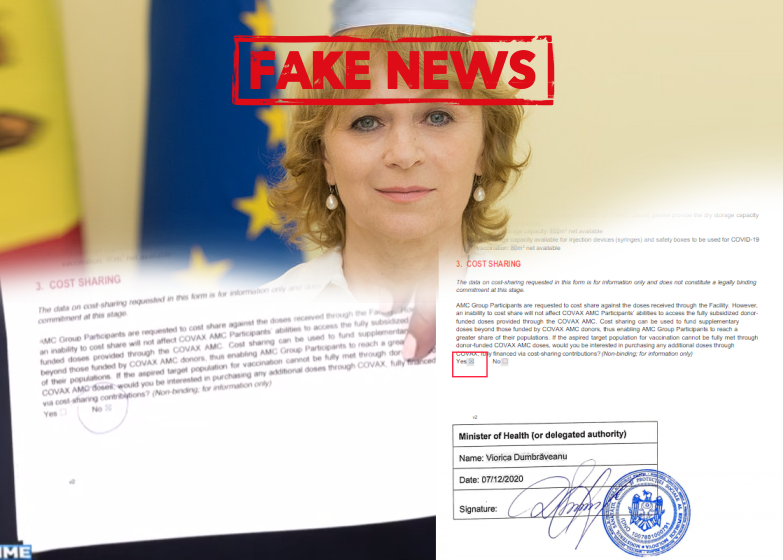 Pe de altă parte, Ministerul Sănătății, Muncii și Protecției Sociale informează că documentul prezentat este un proiect pus în discuție și care niciodată nu a fost expediat la COVAX. Mai mult, ministerul a publicat și documentul semnat la 7 decembrie 2020, care demonstrează că Viorica Dumbrăveanu a solicitat platformei COVAX includerea țării noastre în programul Cost-Sharing.