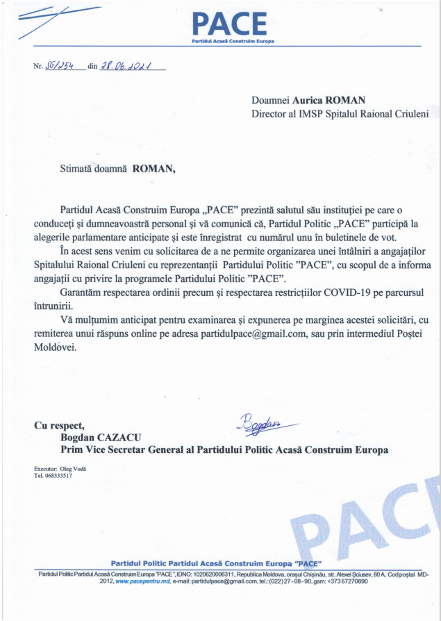 Drept probe, PACE a prezentat și demersul transmis la Spitalul raional Criuleni, mesajul de confirmare din partea administrației instituției, dar și înregistrarea discuției telefonice dintre candidatul PACE pentru funcția de deputat Rodica Negrei cu directorul și secretara acesteia.