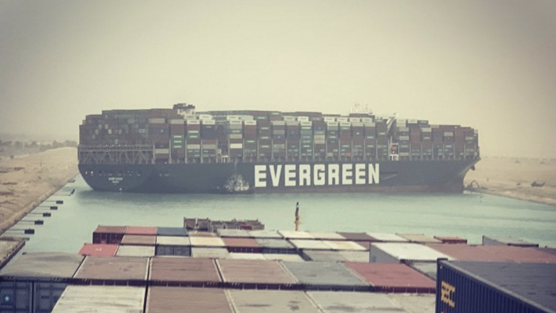 Fotografiile făcute de pe o altă navă din canal, Maersk Denver, arată nava într-un unghi care blochează complet calea navigabilă.