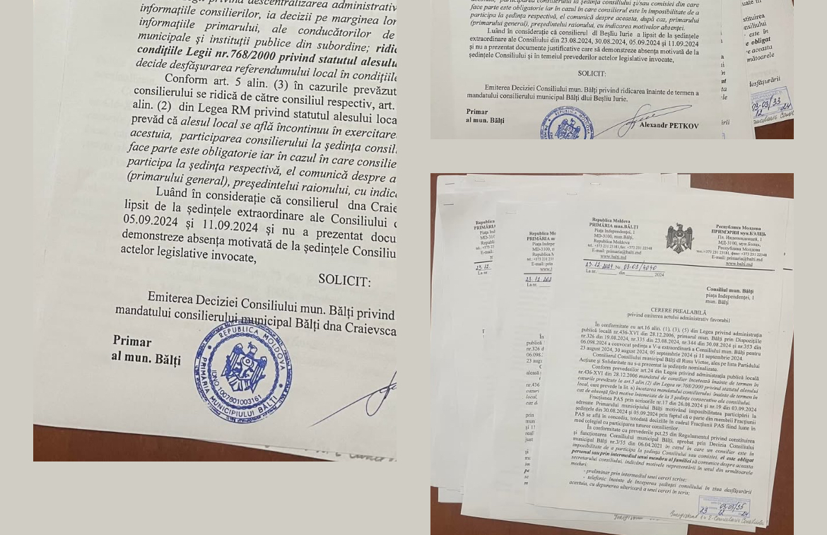 În cadrul Consiliului Municipal Bălți a fost demarată procedura legală privind încetarea anticipată a mandatelor consilierilor din Coaliția care, conform declarațiilor autorităților locale, promovează haosul în oraș.