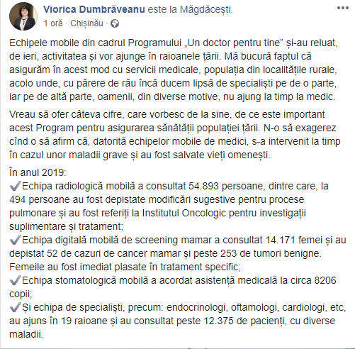 „N-o să exagerez cînd o să afirm că, datorită echipelor mobile de medici, s-a intervenit la timp în cazul unor maladii grave și au fost salvate vieți omenești.”, subliniază Viorica Dumbrăveanu, într-o postare pe facebook.
