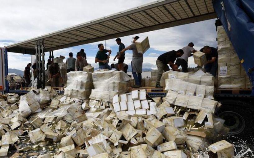 Manifestanții au spart în mijlocul drumului aproximativ zece mii de sticle de vin, au golit cisterne cu vinuri rosé și au dat foc unor lăzi cu roșii, toate provenind din Spania, scrie Biziday.