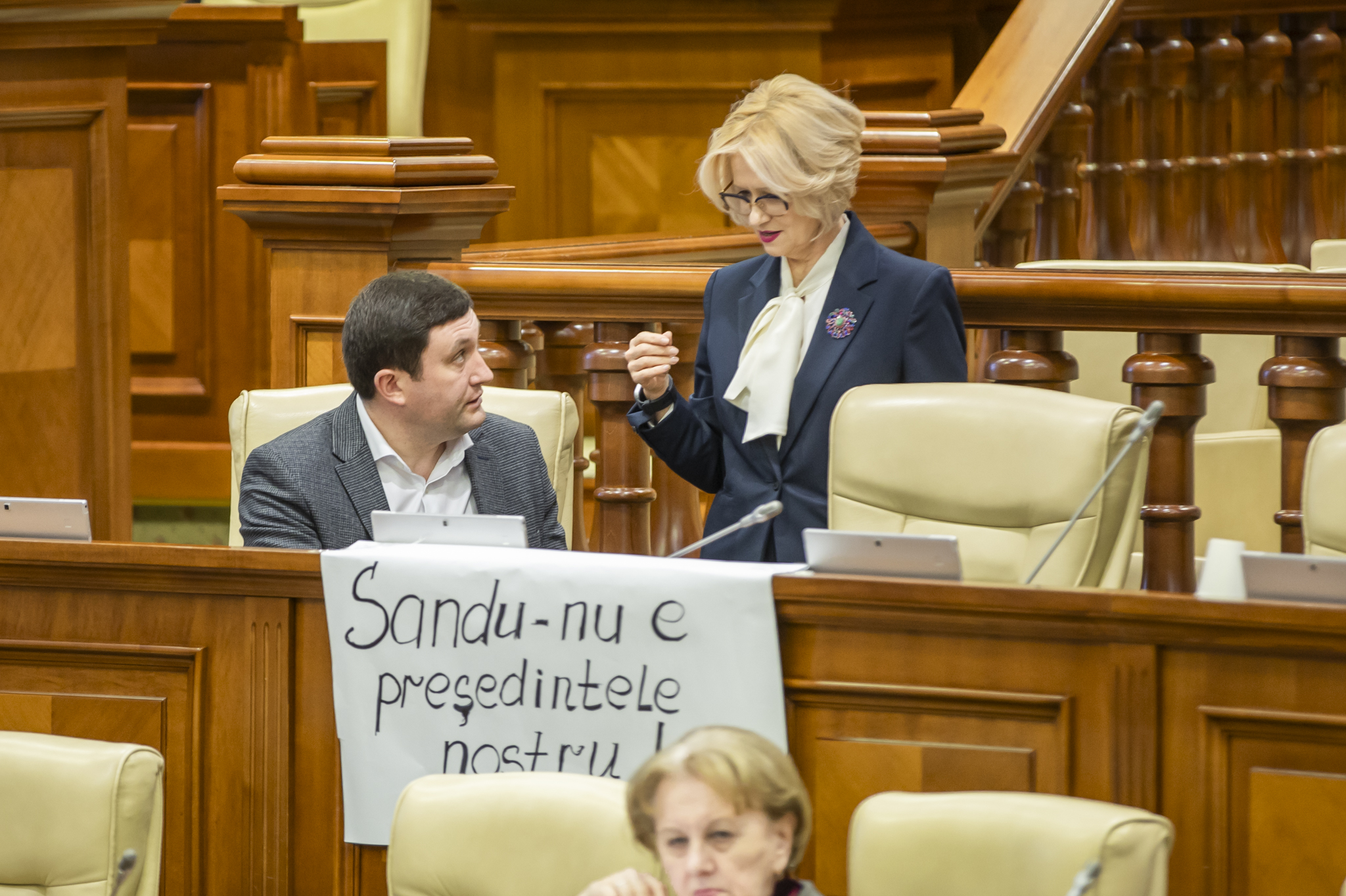 Deputații Blocului Comuniștilor și Socialiștilor au întâmpinat-o pe președintele țării, care a venit în Parlament pentru a rosti un discurs în sprijinul partidului de guvernământ PAS, cu pancarte: „Sandu nu este președinta noastră!”, „Sandu – regina criminalilor”, „Sandu – președinta războiului”, „Jos dictatura!”.