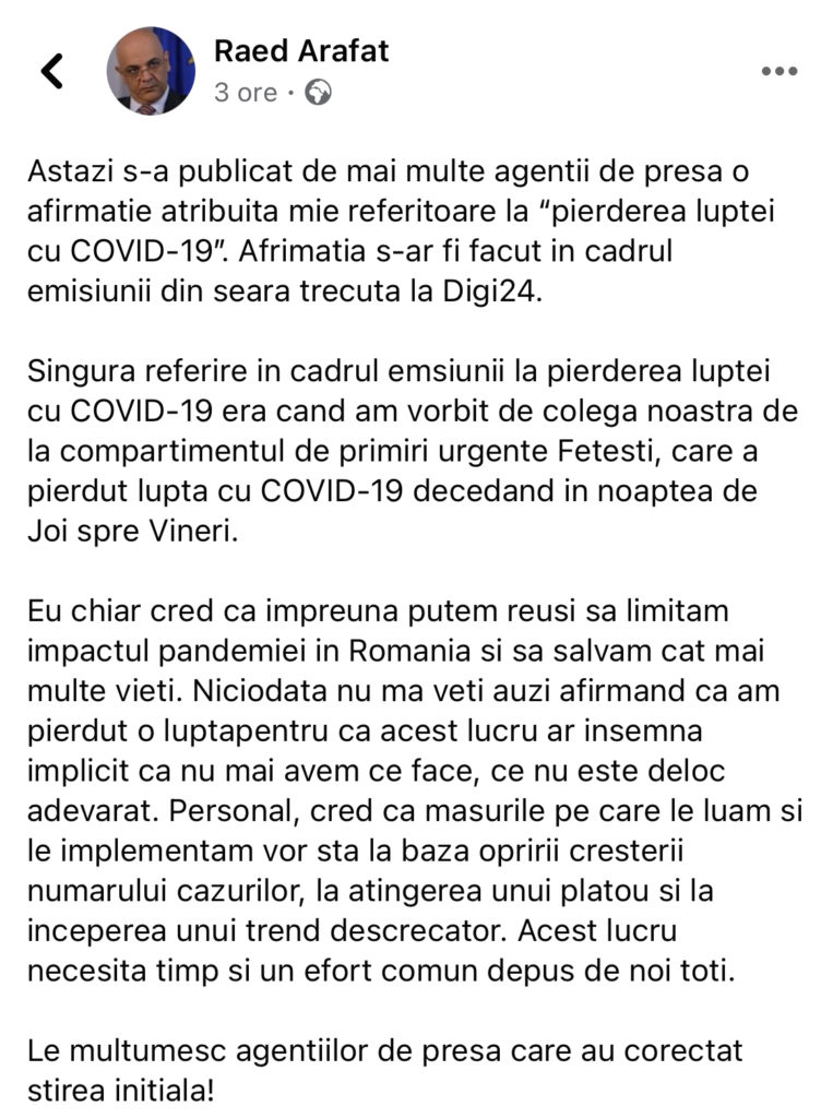 Astăzi s-a publicat de mai multe agenții de presă din România o afirmație atribuită lui Raed Arafat referitoare la “pierderea luptei cu COVID-19”. Afirmația s-ar fi făcut în cadrul emisiunii din seara trecută la Digi24.