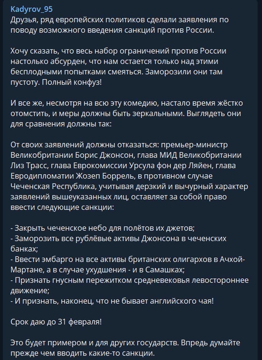 „Premierul britanic Boris Johnson, secretara de externe Liz Truss a Marii Britanii, președinta Comisiei Europene Ursula von der Leyen și șeful diplomației europene Josep Borrell trebuie să-și retragă declarațiile privind sancțiunile împotriva Rusiei din cauza operațiunii militare din Ucraina „până la 31 februarie”, a scris Kadîrov pe canalul său de Telegram.