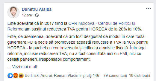 Într-o postare recentă pe facebook, deputatul PAS Dumitru Alaiba a recunoscut că pe vremea când era în opoziție (2018) cerea ca TVA-ul pentru HoReCa (hoteluri, restaurante și cafenele) să fie redus de la 20 la 10%. Guvernul Filip de atunci așa și a făcut, a redus taxa. ACUM după ce a venit la putere, Alaiba deja spune că această taxă din contra trebuie ridicată înapoi la 20%. Schimbarea radicală a poziției sale referitor la aceeași problemă a produs dezamăgirea multor susținători ai blocului ACUM.