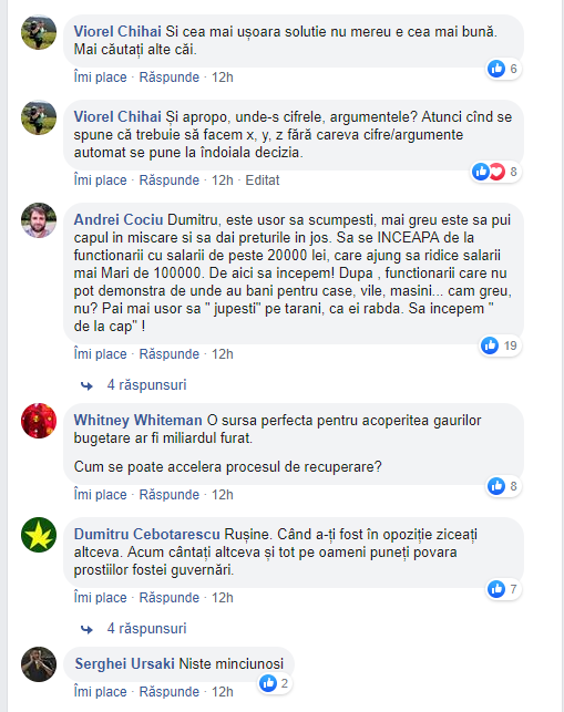 Andrei Cociu: „Dumitru, este usor sa scumpesti, mai greu este sa pui capul in miscare si sa dai preturile in jos. Sa se INCEAPA de la functionarii cu salarii de peste 20000 lei, care ajung sa ridice salarii mai Mari de 100000. De aici sa incepem! Dupa , functionarii care nu pot demonstra de unde au bani pentru case, vile, masini… cam greu, nu? Pai mai usor sa ” jupesti” pe tarani, ca ei rabda. Sa incepem ” de la cap!”