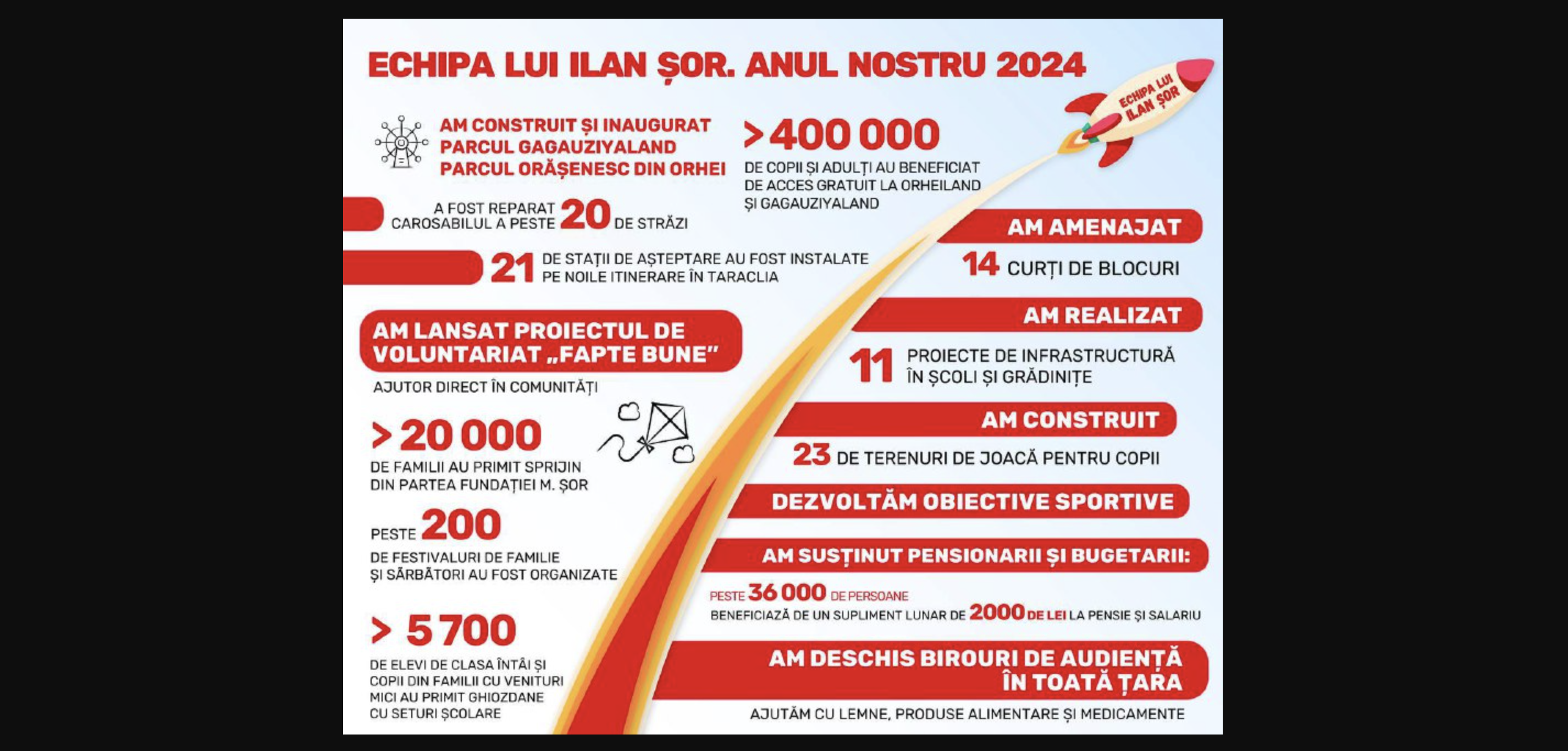 În anul 2024, echipa lui Ilan Șor a continuat munca activă pentru îmbunătățirea vieții cetățenilor moldoveni. În pofida obstacolelor din partea actualei guvernări, un șir de proiecte sociale și de infrastructură au fost implementate în Orhei și raionul Orhei, în Taraclia, Găgăuzia, Bălți și în alte localități din țară.