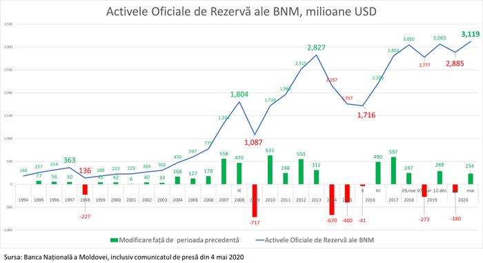 Precedentul record a fost înregistrat în decembrie 2019 când activele oficiale de rezervă au ajun la 3.065 milioane USD. Apoi a urmat o scădere de 180 milioane USD și în aprilie 2020 rezervele BNM s-au redus până la 2.885 milioane USD.