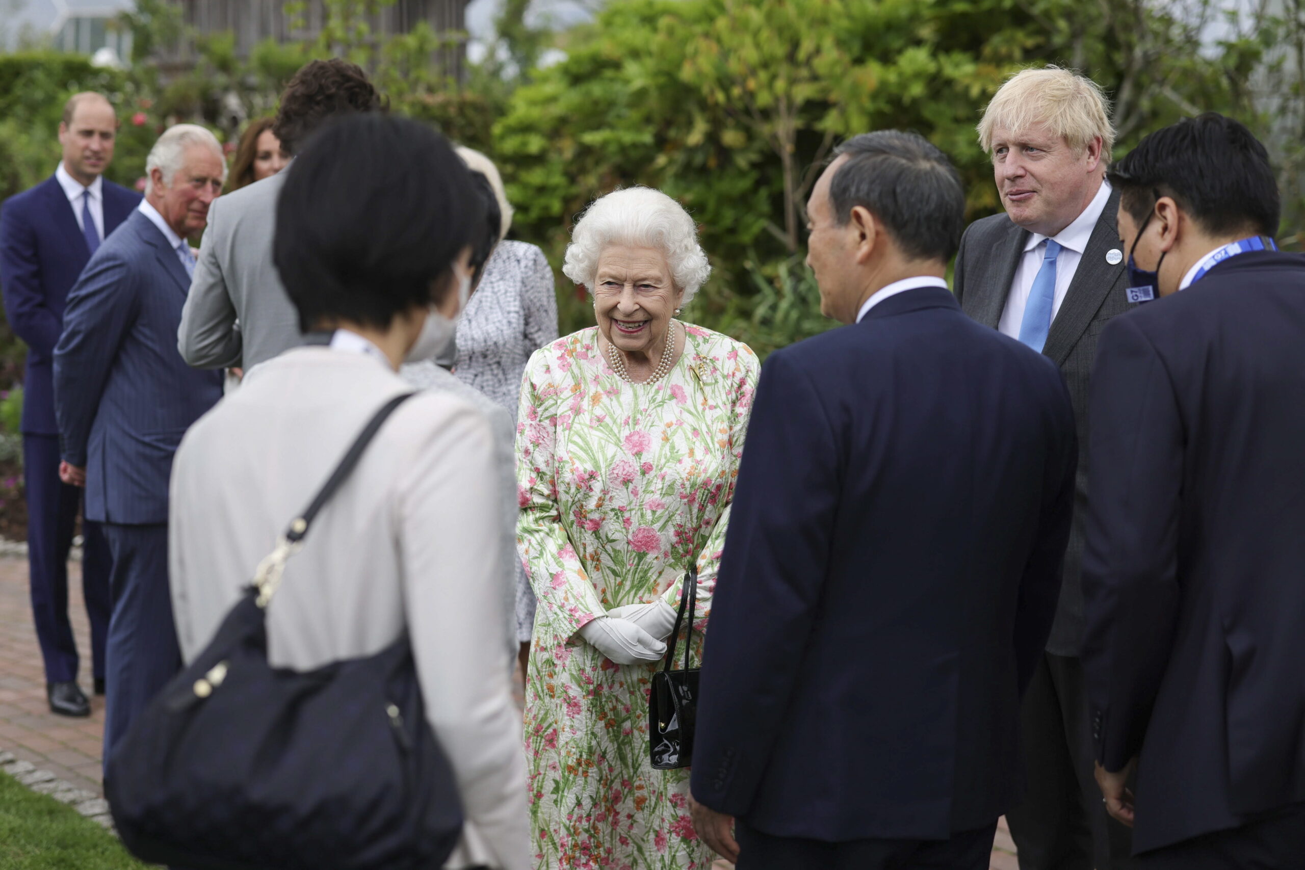epa09263433 A handout photo made available by 10 Donwing Street shows Britain’s Queen Elizabeth II (C) with Britain’s Prime Minister Boris Johnson (2-R) at a reception during the G7 summit in St Austell, Cornwall, Britain 11 June 2021. Britain is hosting the Group of Seven (G7) summit in Cornwall in from 11 to 13 June 2021. EPA/ANDREW PARSONS/DOWNING STREET / HANDOUT This image is for Editorial use purposes only. The Image can not be used for advertising or commercial use. The Image can not be altered in any form. Downing street handout. HANDOUT EDITORIAL USE ONLY/NO SALES