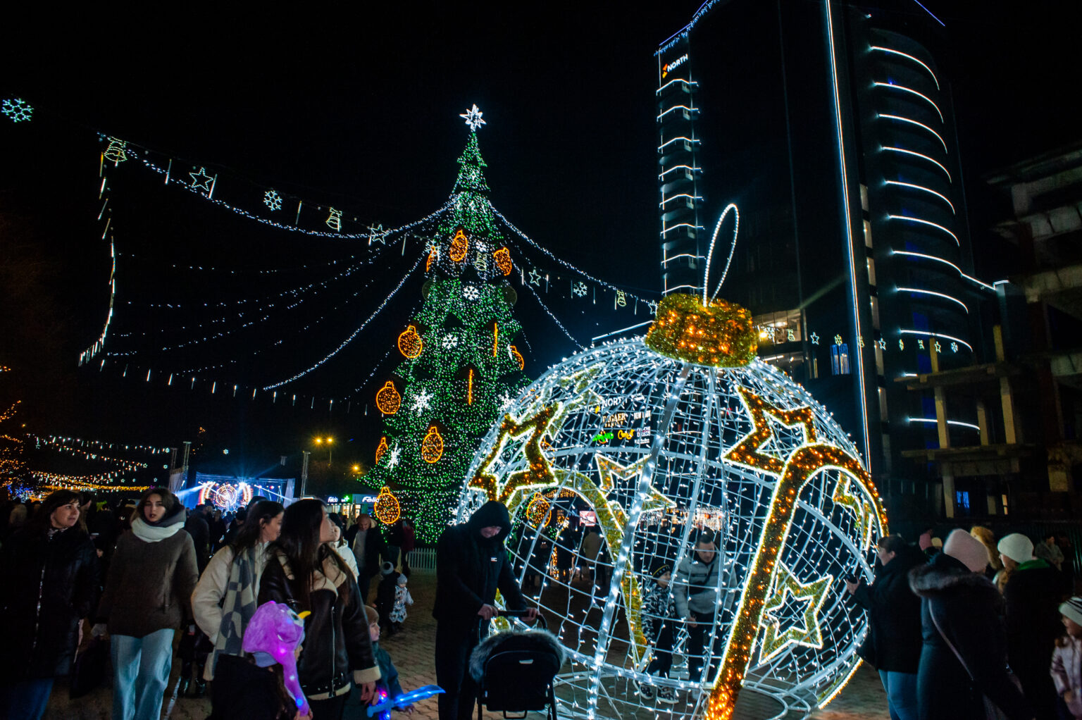Bradul, iluminatul festiv și numeroasele instalații au fost oferite în dar bălțenilor de către Renato Usatîi, președintele Partidului Nostru și fost primar al municipiului.