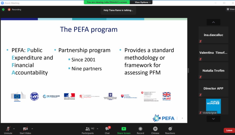 Atelierul s-a desfășurat în format online și a întrunit reprezentanți ai Parlamentului, Ministerului Finanțelor, Curții de Conturi, Cancelariei de Stat, Ministerului Sănătății, Muncii și Protecției Sociale, Agenției Achiziții Publice, Companiei Naționale de Asigurări în Medicină, Serviciului Fiscal de Stat, Serviciului Vamal, Inspecției Financiare etc.