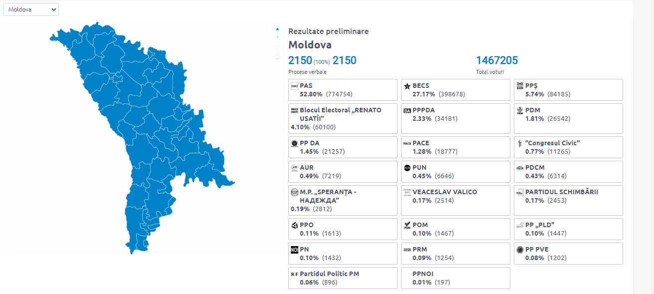 După prelucrarea a 100% procese verbale, potrivit rezultatelor preliminare, Partidul Acțiune și Solidaritate (PAS) a obținut, la alegerile parlamentare anticipate din 11 iulie curent, 52,80% sau 774 754 voturi.