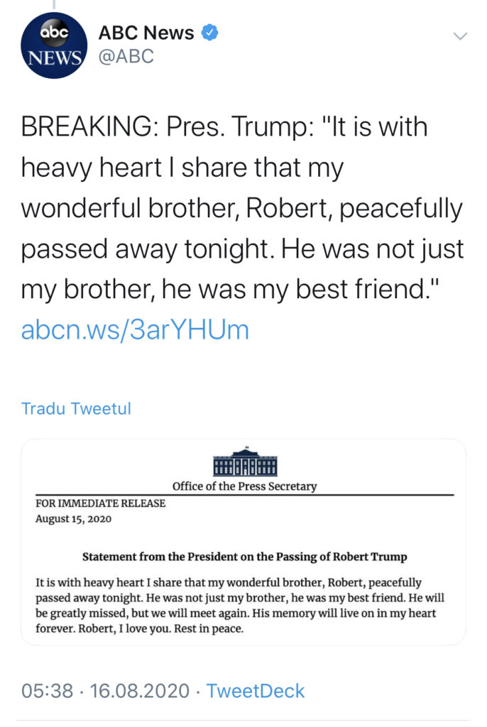 „Cu inima îndurerată vă spun că minunatul meu frate, Robert, a trecut la cele veșnice, în liniște, noaptea trecută. Nu a fost doar fratele meu, a fost cel mai bun prieten pe care l-am avut. Ne va lipsi mult, dar ne vom reîntâlni. Amintirea lui va continua să fie vie în inima mea, pentru totdeauna. Robert, te iubesc. Odihnește-te în pace”, a spus președintele, citat de CNN.