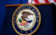 FILE PHOTO: The seal of the U.S. Justice Department is seen on the podium in the Department’s headquarters briefing room before a news conference with the Attorney General in Washington, January 24, 2023. REUTERS/Kevin Lamarque//File Photo