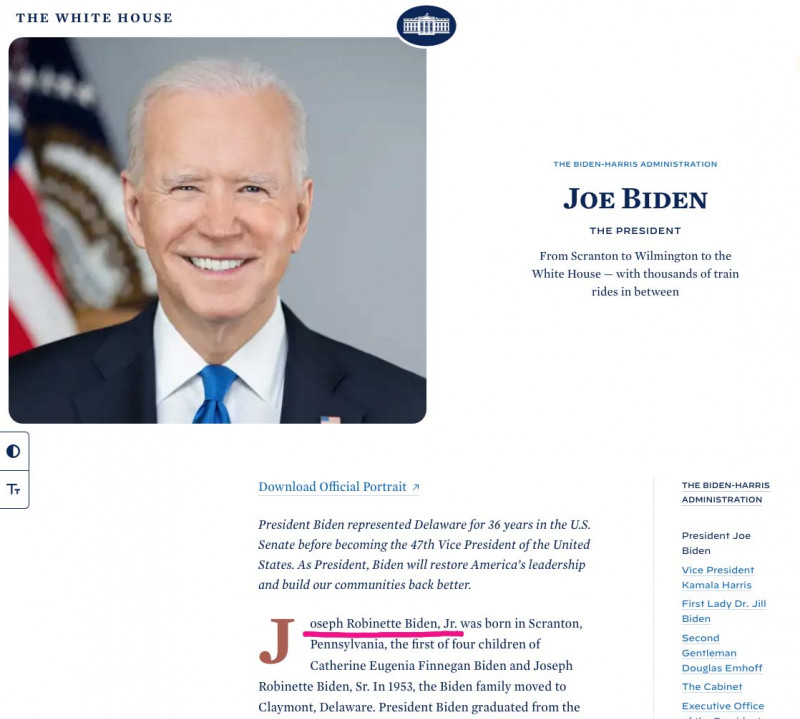 Pe site-ul oficial al Casei Albe, la secțiunea unde este biografia președintelui, Joseph Robinette Biden, Jr. este trecut ca primul dintre cei patru copii ai lui Catherine Eugenia Finnegan Biden și Joseph Robinette Biden, Sr. (foto).