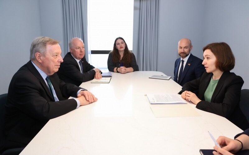 Aflată în America, Sandu s-a întâlnit cu senatorul democrat Dick Durbin și cu congresmanul republican Mike Lawler, cu care a abordat relațiile de bună cooperare și prietenie moldo-americană. Oficialii au vorbit și despre provocările de securitate din regiune și cum acestea afectează Republica Moldova. Au discutat și despre cum Statele Unite pot să ajute țara să facă mai ușor față provocărilor curente. Ea a mulțumit cu această ocazie pentru asistența pe care a primit-o Republica Moldova în cei 30 de ani de colaborare pentru a avea o democrație mai puternică.
