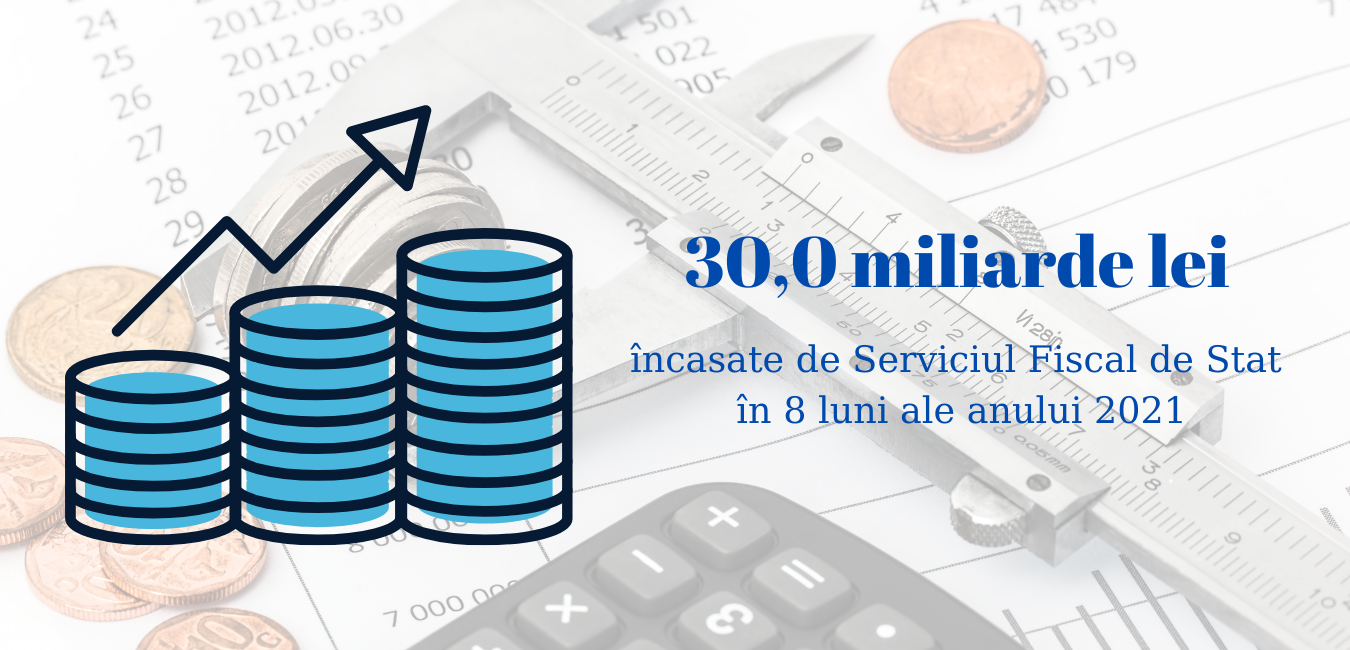 Încasările la Bugetul public național administrate de Serviciul Fiscal de Stat au constituit în 8 luni ale anului curent 30,0 miliarde lei, ceea ce denotă o creștere cu peste 4,5 miliarde lei sau cu 17,9 % în raport cu perioada similară a anului precedent.