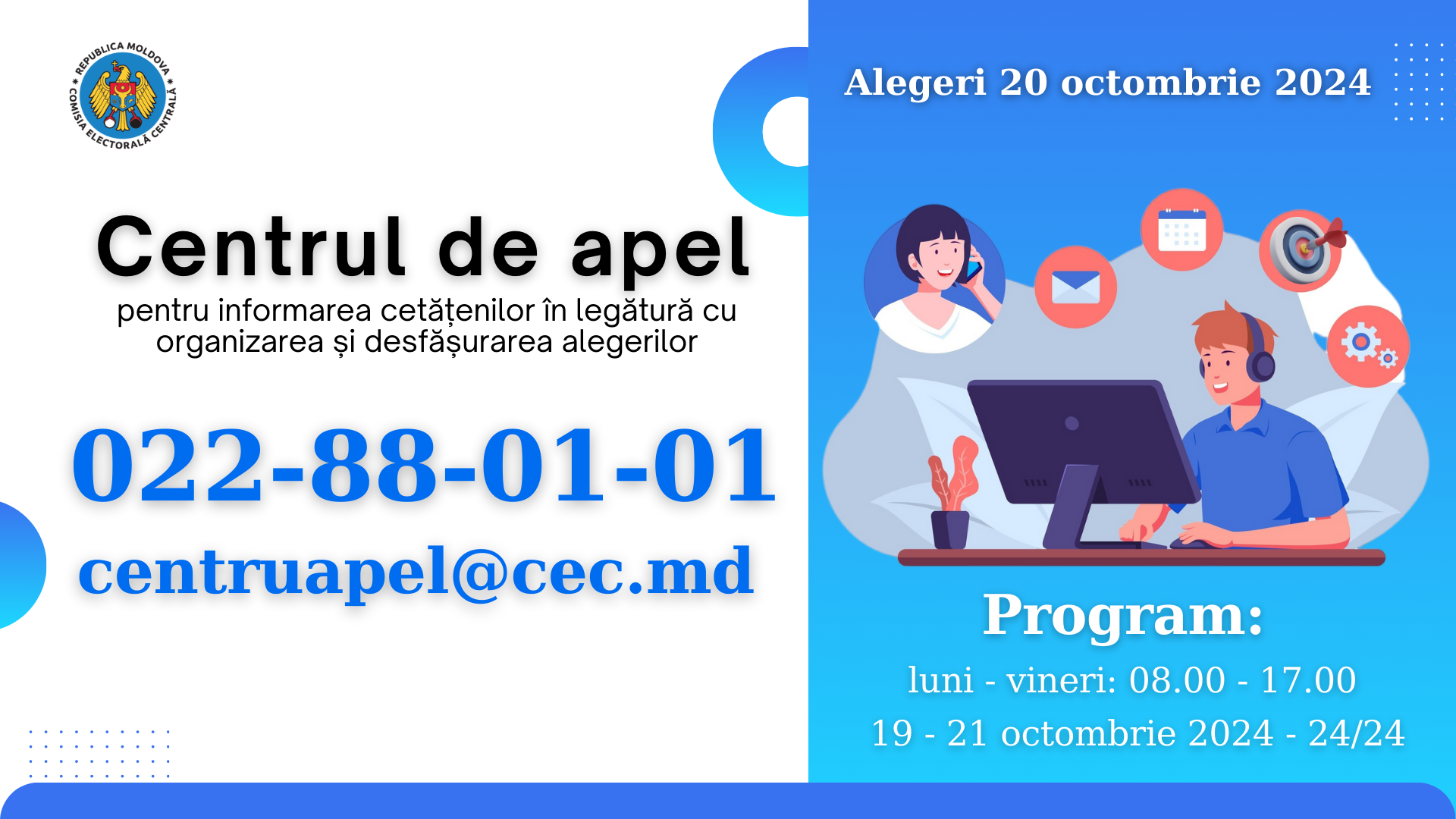 Cetățenii cu drept de vot pot solicita informații despre organizarea referendumului republican constituțional și alegerilor pentru funcția de Președinte al Republicii Moldova din 20 octombrie 2024, apelând Centrul de Apel, cu numărul unic de telefon (+373) 22 880101.