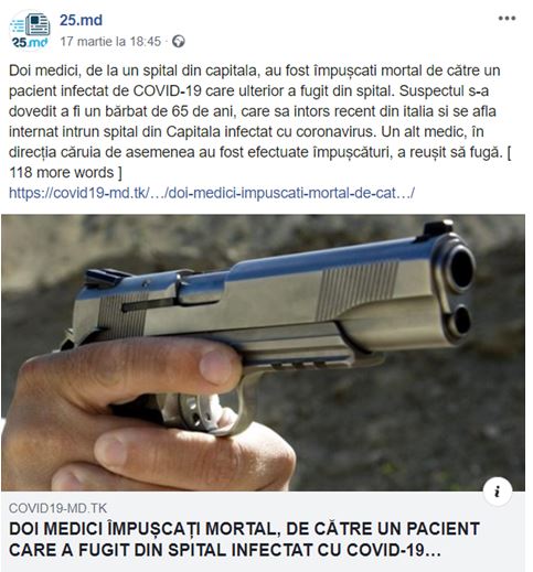 În vederea diminuării impactului știrilor false cu privire la evoluția COVID-19, Vă îndemnăm în cazul identificării acestora precum și a conturilor false utilizate pe rețelele de socializare utilizate în distribuirea intensă a dezinformărilor, să transmiteți informația în adresa Serviciului de Informații și Securitate, la adresa de e-mail: press@sis.md precum și să raportați publicațiile și conturile administratorilor rețelei de socializare utilizate.