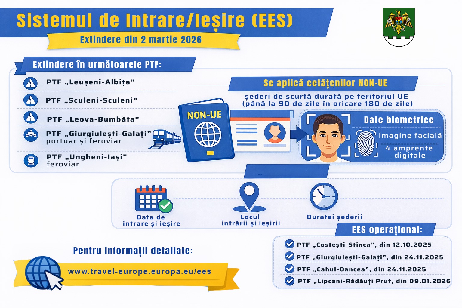 Începând cu data de 2 martie 2026, Sistemul de Intrare/Ieșire (EES) al Uniunii Europene va deveni operațional și la punctele de trecere a frontierei Leușeni-Albița, Sculeni-Sculeni, Leova-Bumbăta, Giurgiulești-Galați, portuar și feroviar, precum și Ungheni-Iași, feroviar.