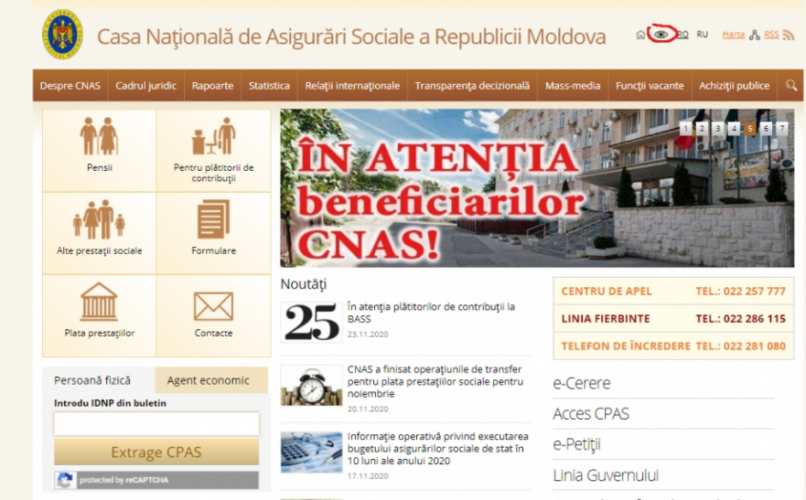 Site-ul oficial al CNAS a fost adaptat pentru persoanele cu dizabilităţi de vedere.  Utilizatorii acestei aplicaţii vor putea afla cu uşurinţă cele mai actuale informaţii ce ţin de stabilirea şi plata pensiilor şi altor prestaţii sociale.