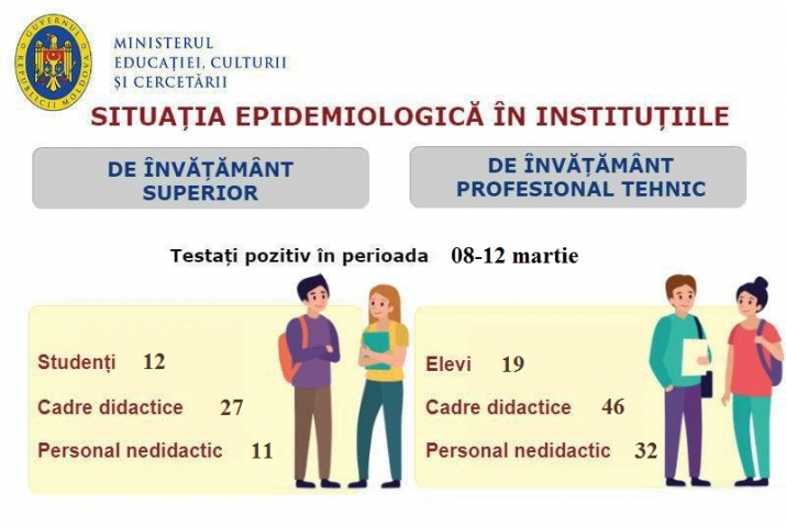 În învățământul profesional tehnic, în perioada 08-12 martie, 19 elevi, 46 cadre didactice și 32 de persoane din alte categorii de personal au fost infectați cu virusul Covid-19.