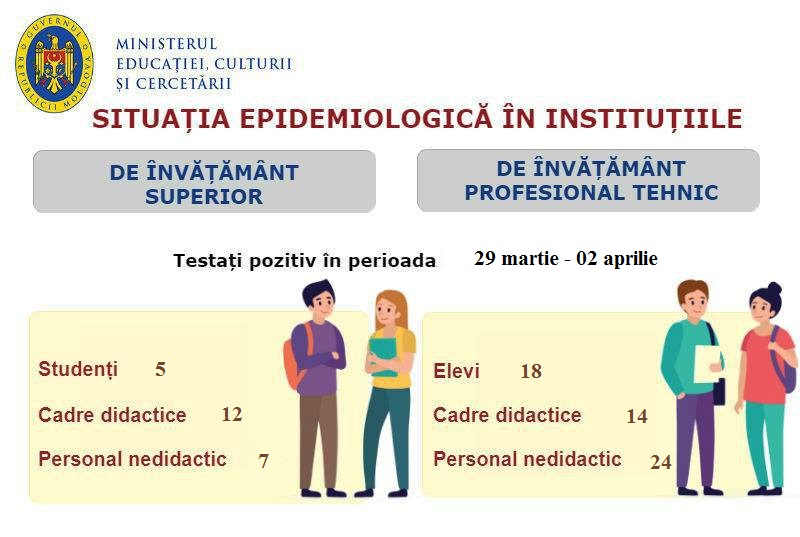 În perioada 29 martie-02 aprilie, în instituţiile de învăţământ superior au fost confirmați pozitiv 5 studenți, 12 cadre didactice și 7 cadre auxiliare, iar în autoizolare au fost plasați 1 studenți, 5 cadre didactice și 3 cadre auxiliare.