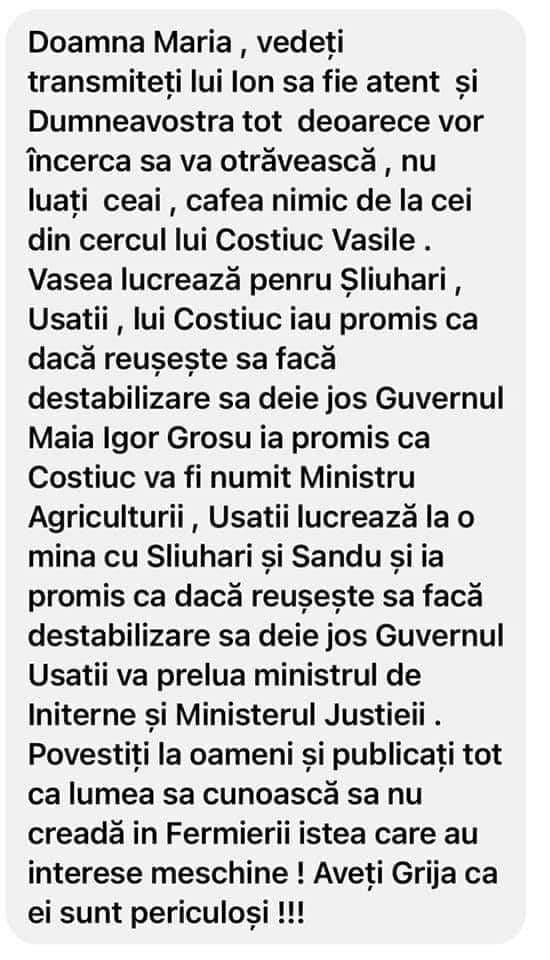 “Vasea lucrează pentru Șliuhari (p.r. Slusari), Usatîi, lui Costiuc i-au promis că dacă reușește să facă destabilizare, să dea jos Guvernul, Maia, Igor Grosu i-a promis că Costiuc va fi numit ministru al Agriculturii”, se mai arată în mesaj.