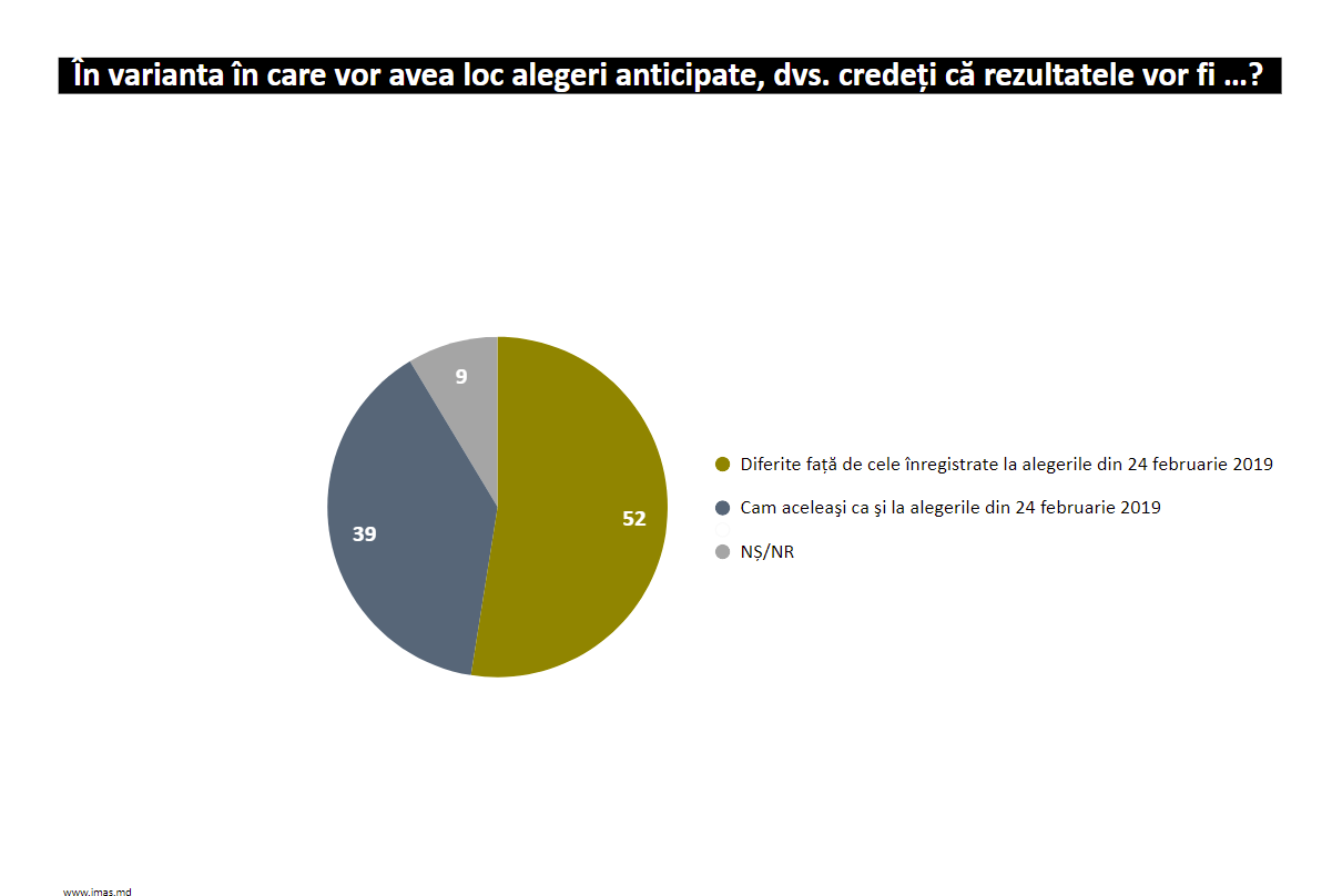 În caz de anticipate, puțin peste jumătate din moldoveni consideră că se va schimba configurația Parlamentului, în timp ce 39% sunt de părerea că rezultatele vor fi aceleași, iar 9% sunt încă indeciși.