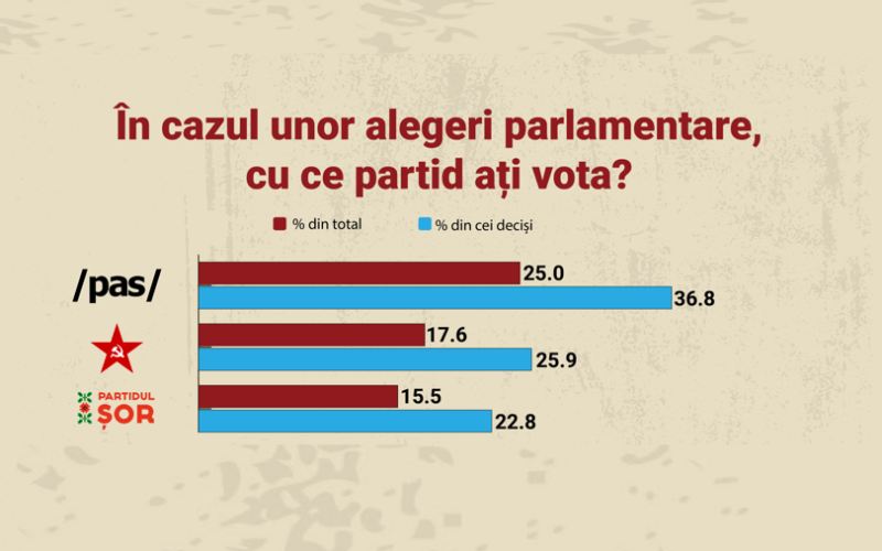 Potrivit opțiunilor exprimate de respondenții deciși, în cazul alegerilor anticipate, Partidul Acțiune și Solidaritate ar obține 25% din voturile totale (36.8% din deciși), Blocul Comuniștilor și Socialiștilor ar obține 17.6% (25.9% din deciși), iar Partidul Politic Șor ar obține 15.5% (22.8% din deciși). Alte partide ar acumula sub 5% din preferințele decișilor, cum ar fi Partidul Dezvoltării și Consolidării Moldovei cu 2.6% din eșantion (3.8% din deciși), Partidul Nostru cu 2.4% (3.5% din deciși) și Mișcarea Alternativa Națională cu 1.2% (1.8% din deciși). Platforma Demnitate și Adevăr, Coaliția pentru Unitate și Bunăstare și Partidul Social Democrat European ar înregistra fiecare sub un procent din totalul respondenților, respectiv 0.9%, 0.9% și 0.8%. Celelalte partide ar obține sub 0.3% din preferințele decișilor.