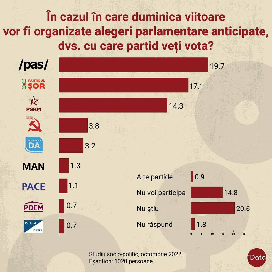 Potrivit unui sondaj publicat astăzi de IData, în cazul unor alegeri anticipate, pentru PAS ar vota 19, 7 dintre alegători, pe locul doi se află Partidul „ȘOR”, pentru care ar vota 17,1 dintre moldovenii cu drept de vot, iar pe locul trei a căzut PSRM, pentru care ar vota 14,3 dintre alegători.